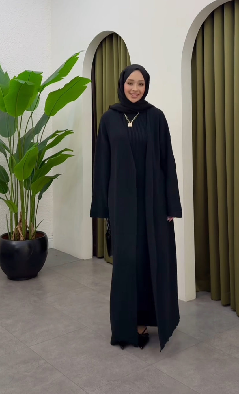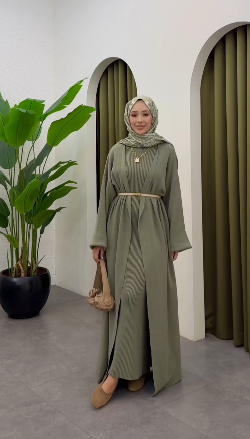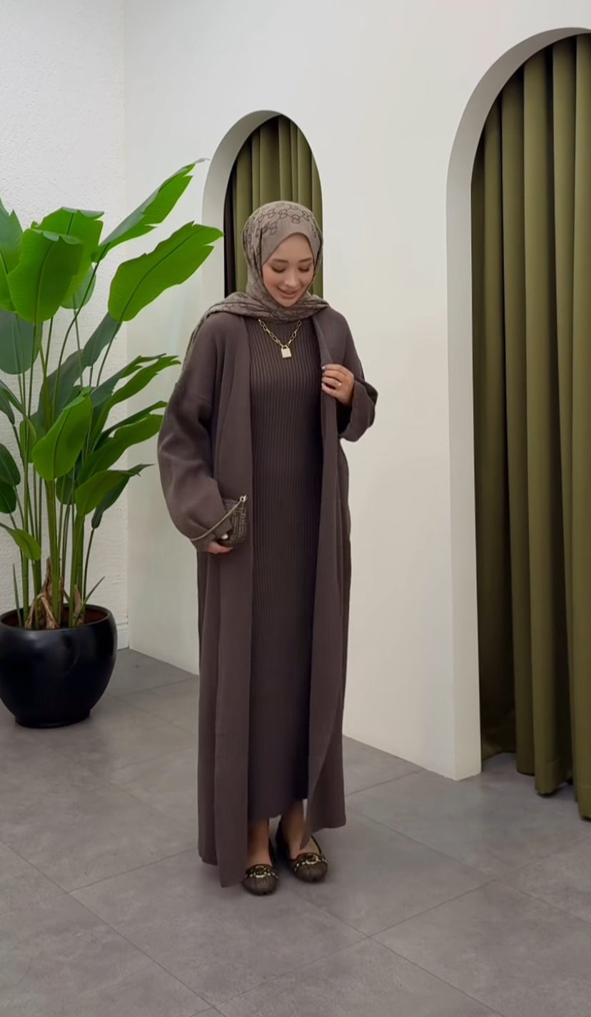 طقم مكوَّن من فستان طويل بقماش مضلّع ناعم وجاكيت بنفس اللون والتصميم الراقي، يمنحك مظهراً أنيقاً ومريحاً في نفس الوقت.